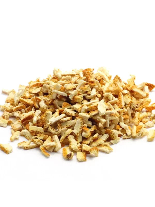 Dried orange peels are rich in aromatic citrus oils. They are used as a natural flavoring in baked goods, desserts, and tea blends.